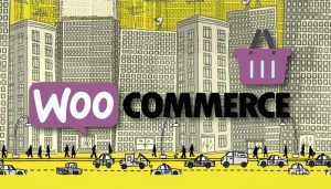 In questa immagine una città stilizzata con un disegno e sopra la scritta WooCommerce